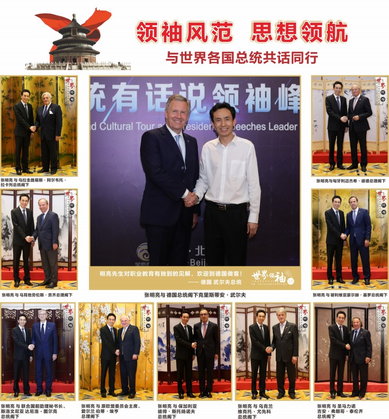 多次接受党和国家领导人接见,受邀出席10国总统访华代表团晚宴,多次受邀与联合国潘基文秘书长、美国奥巴马总统、德国武尔夫总统、波兰科莫罗夫斯基总统等国际领袖共话教育与探讨新形势下全球中小企业的发展之策。