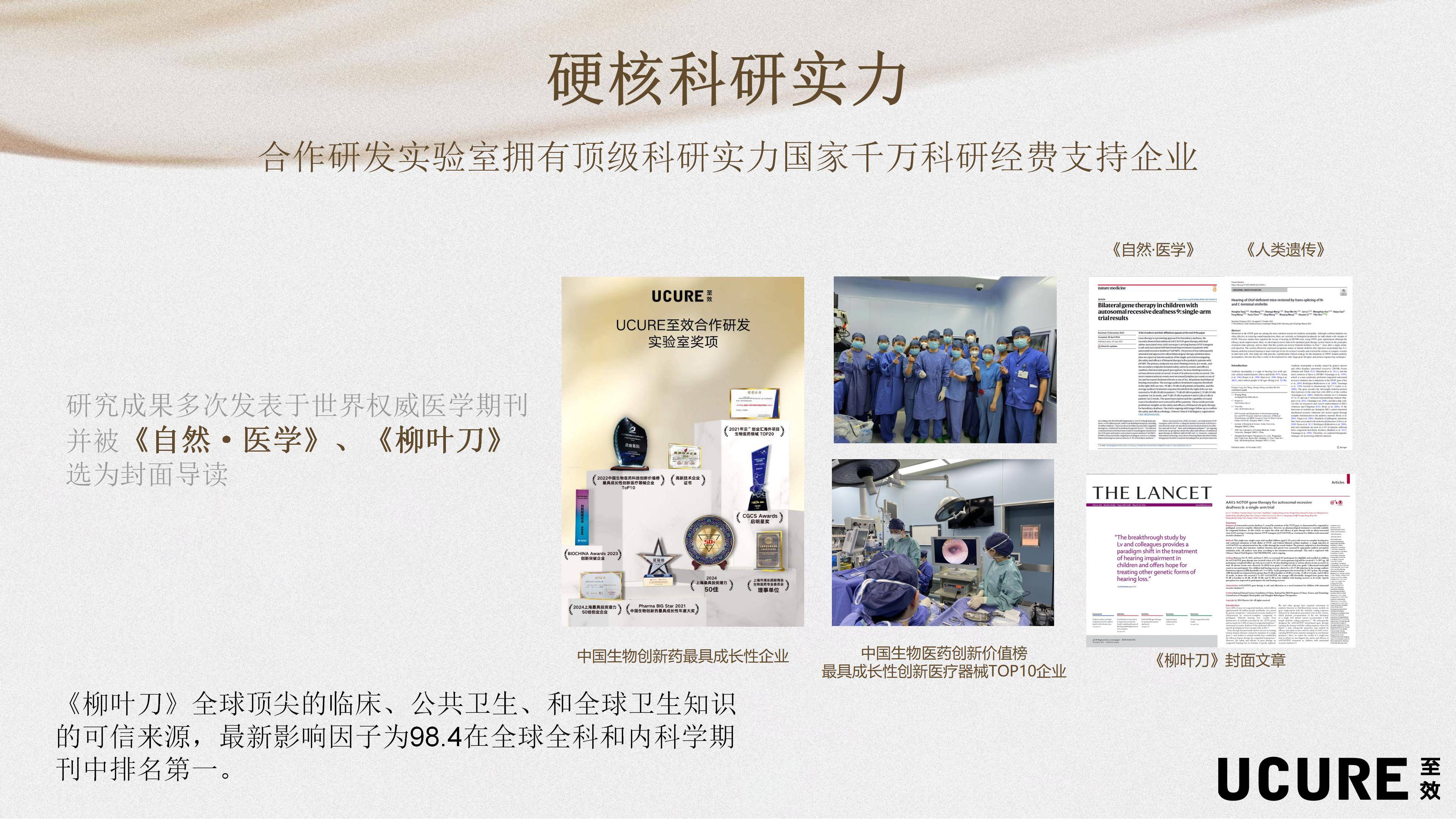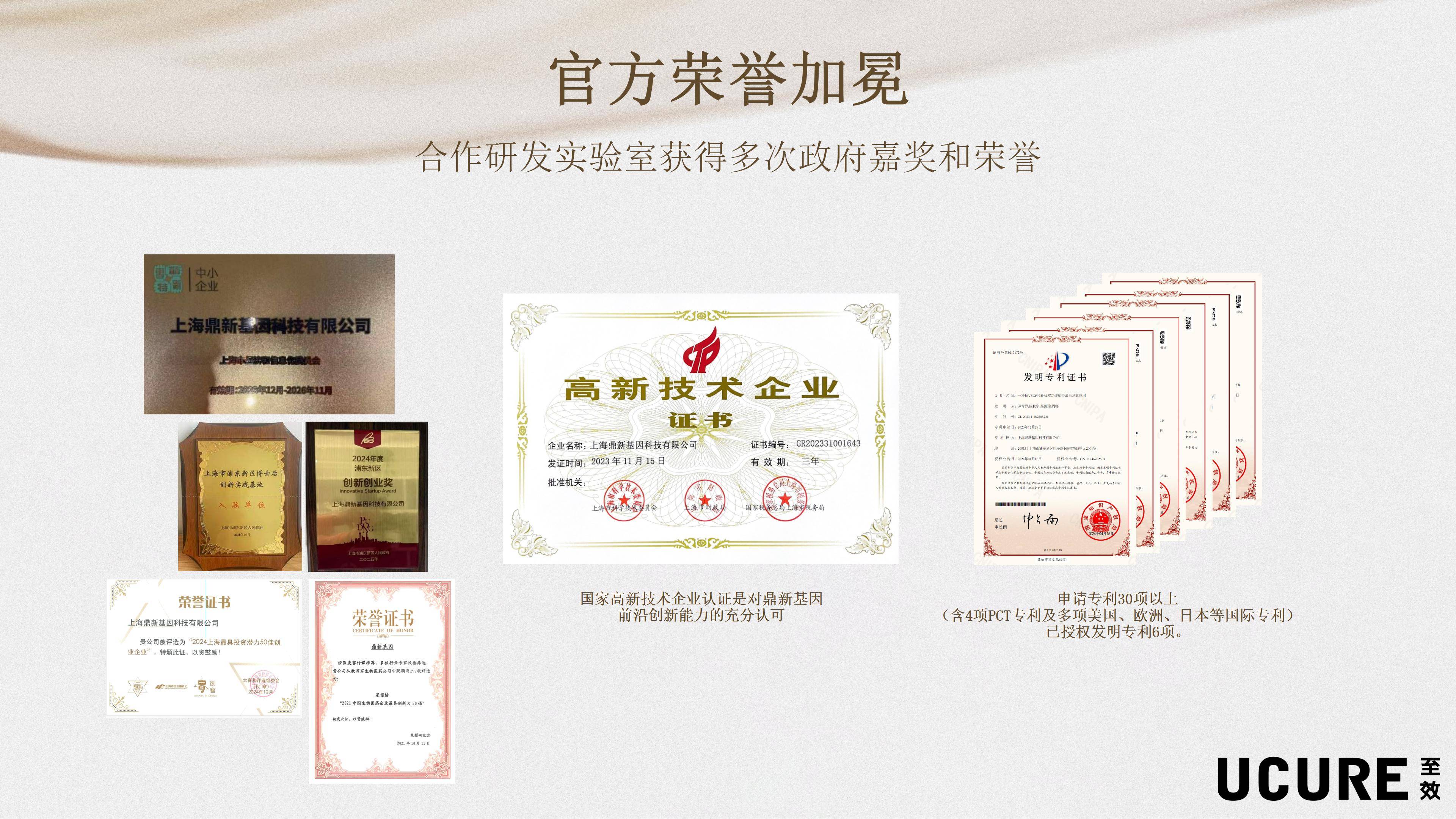 鼎新基因在生物医学领域的顶尖实力与行业标杆地位,印证了UCURE至效的科研理念与产品潜力获得了权威科研机构的高度认可。作为国际领先的生物医学实验室,鼎新基因不仅是获得国家千万科研经费重点扶持的国家高新技术企业,更斩获“中国生物创新药最具成长性企业”认证,其科研硬实力得到国家层面的权威背书。在生物医药开发研究领域,鼎新基因沉淀了数年的深厚经验,组建了顶尖专家组成的科研团队,手握30项以上核心专利技术,其中6项已成功授权发明专利,其重磅科研成果更是登上《柳叶刀》《自然·科学》等国际顶级医学期刊,获得全球科研界的广泛认可。更值得一提的是,鼎新基因实现了全球首例基因治疗药物研发突破,成功治愈双侧先天性耳聋患者,打破了该领域的国际技术壁垒,始终以领先的科研成果推动中国生物医学产业迈向国际前沿。