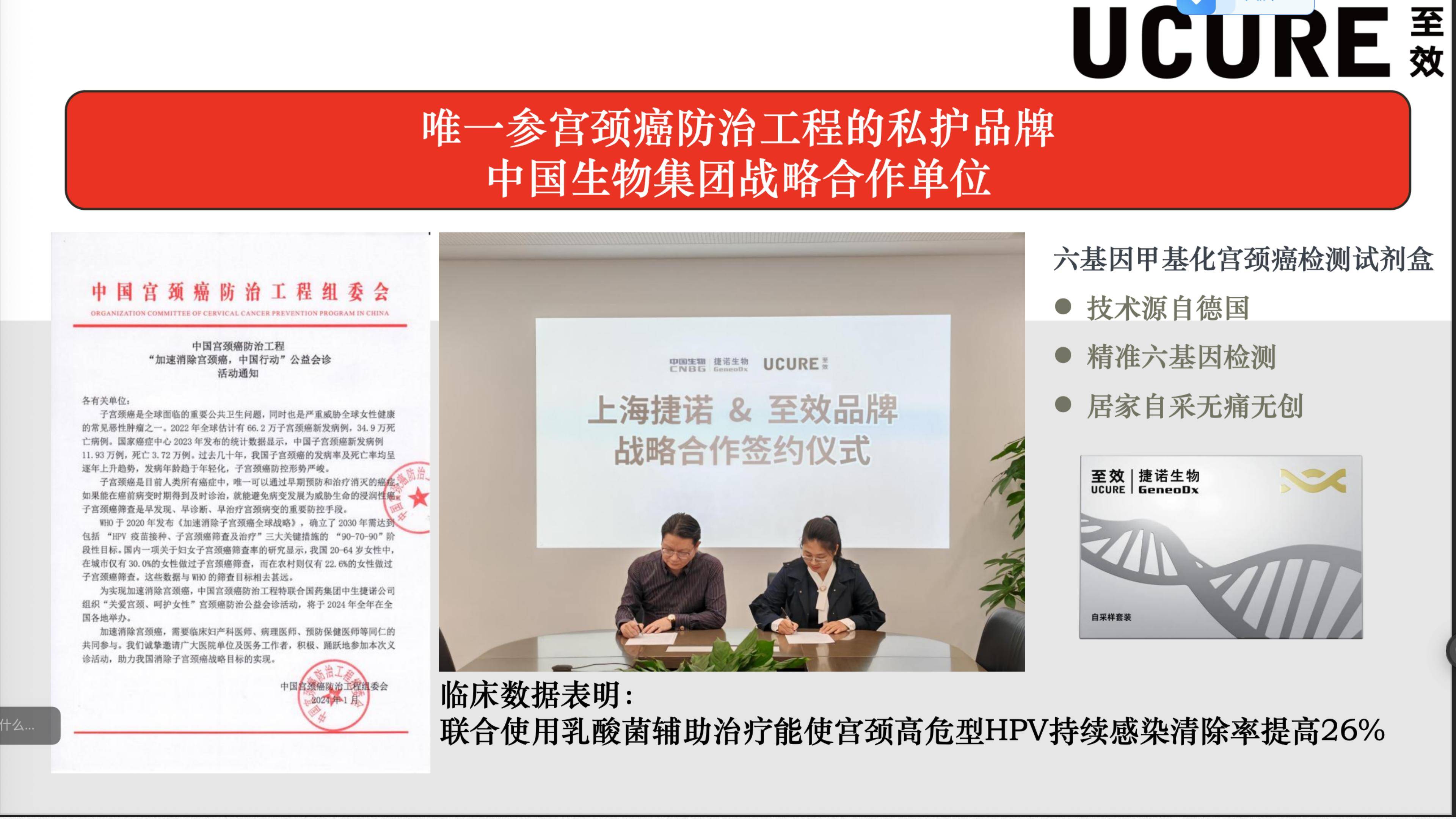 在权威合作与认证方面,UCURE至效率先与中国宫颈癌防治工程协办单位、国药集团下属宫颈癌筛查检测机构达成战略合作,携手推出国内首个六基因甲基化宫颈癌检测试剂盒,率先实现女性居家无痛无创采样,使宫颈癌检测与预防更加准确便捷。