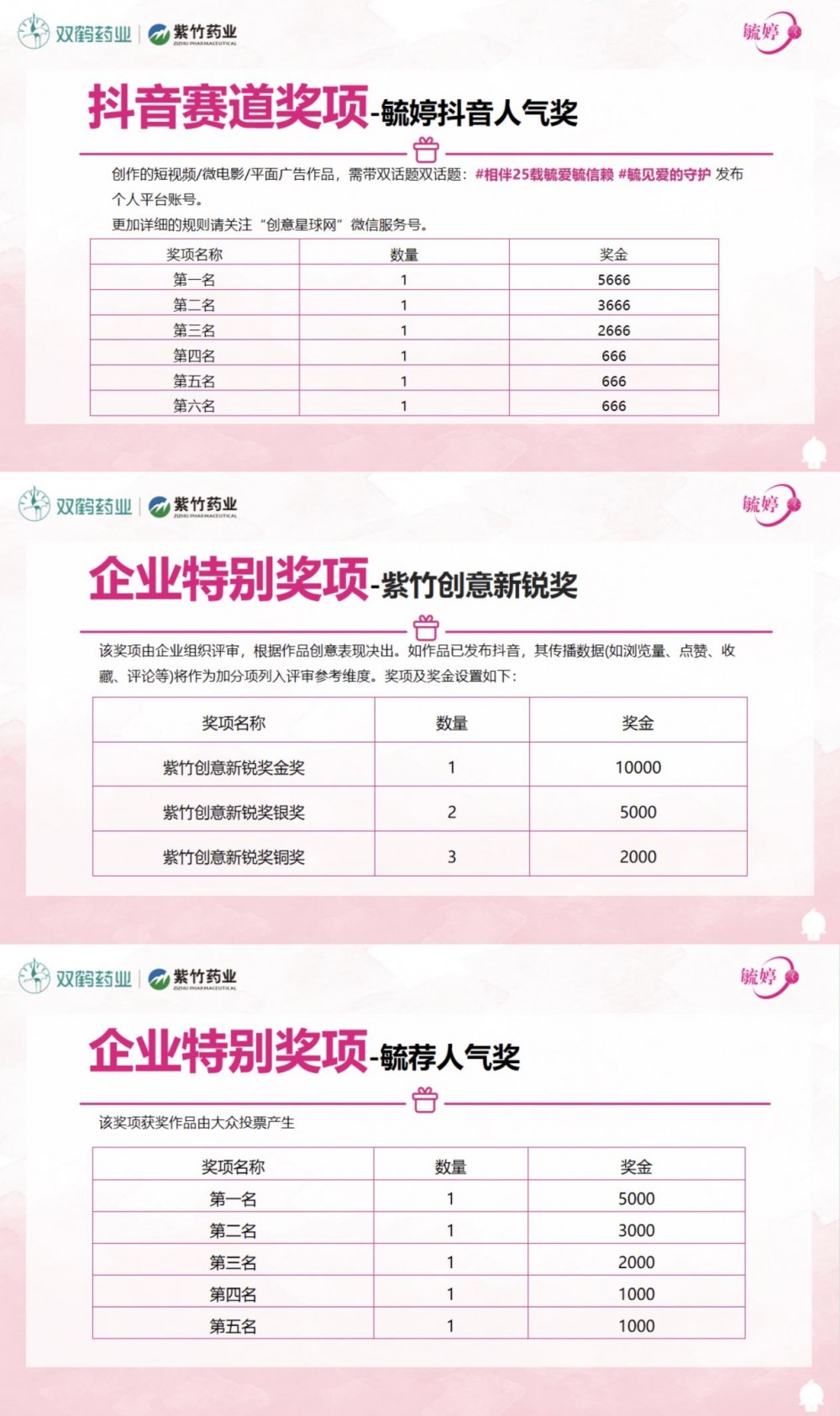 为激励更多学子参与命题创作,持续放大青春声量,毓婷特别增设“毓婷抖音人气奖”“紫竹创意新锐奖”“毓荐人气奖”三大重磅奖项。一份作品可参与多重奖项角逐,万元丰厚奖金为创意加码,全面助力优质创意脱颖而出。